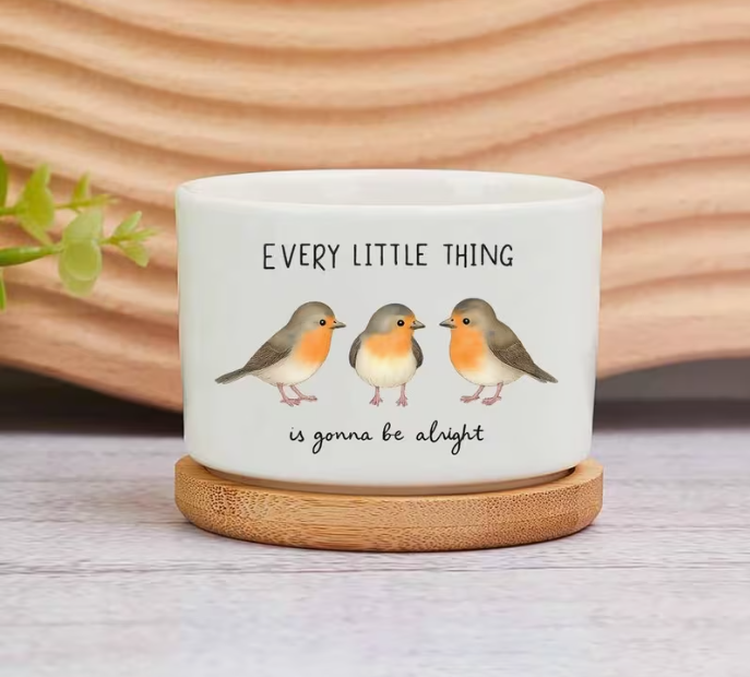 White ceramic planter with cute Robin design & "Everything Will Be Alright" Quote, comes with bamboo saucer.